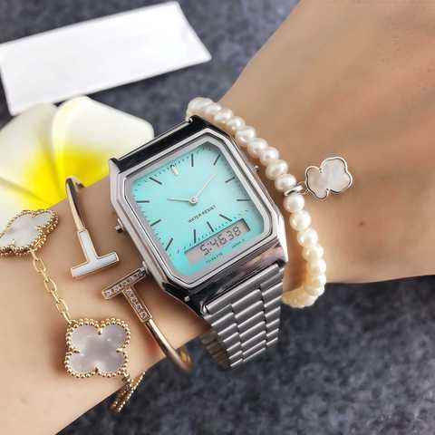 Novo Estoque Relógio Eletrônico Multifuncional Feminino com Duplo Display Pulseira de Aço Inoxidável Simples Casual Pequeno Mostrador Alarme